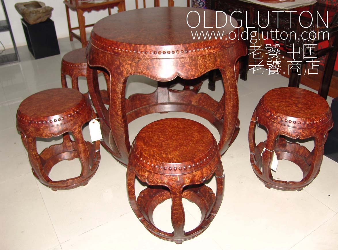 Gall wood five-opening drum table drum stool.Size: Table: 77.5 cm in diameter, 80 cm in height, stool: 31.5 cm in diameter, 49 cm in height.