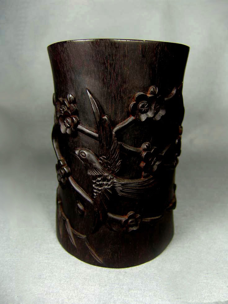Leaflet Rosewood Pen Holder With Flower and Bird Carving.