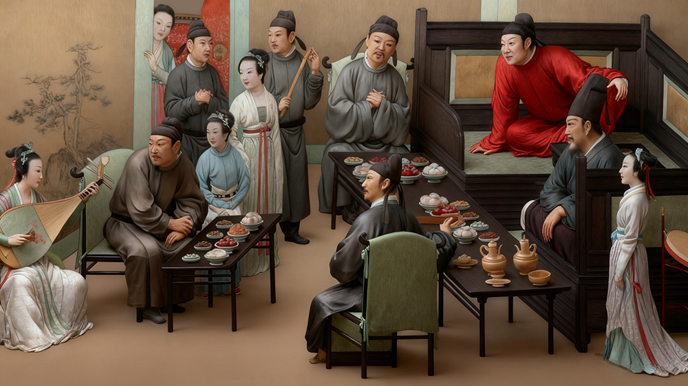 唐宋人似乎不怎么讲究大吃大喝。像五代顾闳中所绘《韩熙载夜宴图》主人客人面前案上所列的食物不过八品,四个髙足的浅碗,四个小碟子。有一碗是白色的圆球形的东西,有点像外面裹了米粒的蓑衣丸子。有一碗颜色是鲜红的,很惹眼,用放大镜细看,不过是几个带蒂的柿子!