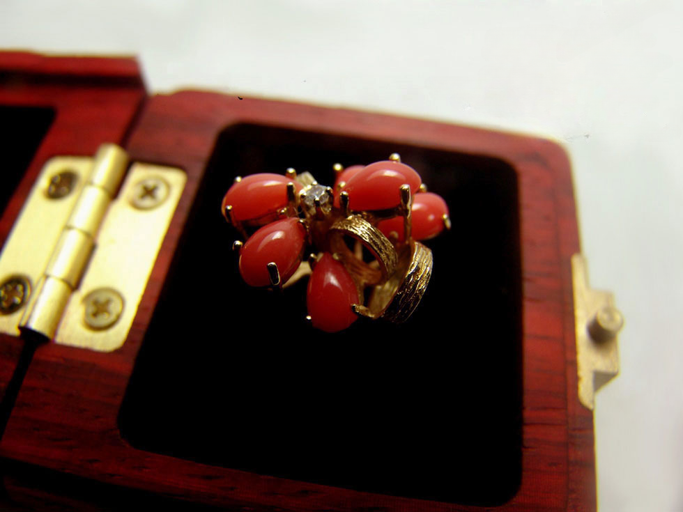 14K金,天然红珊瑚,配钻石,做工精致。14k gold, natural red coral, with diamonds, exquisite workmanship.