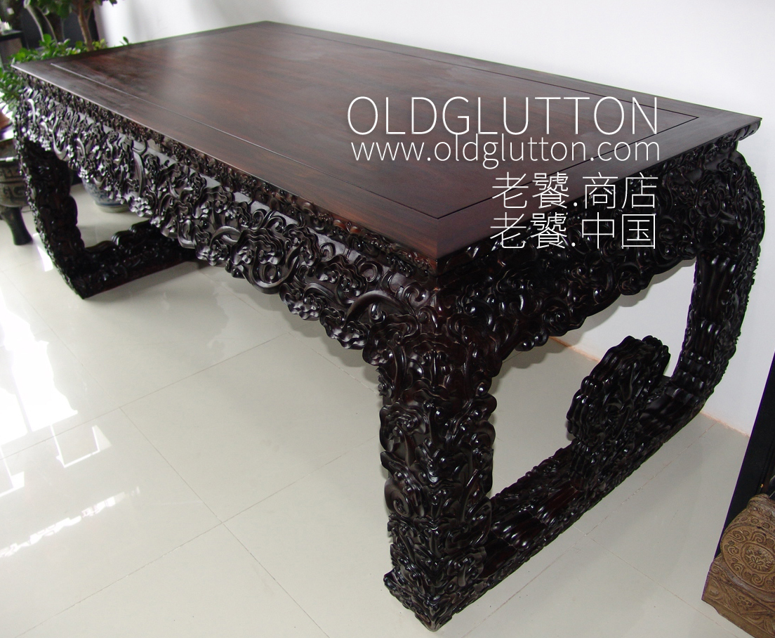 卢氏黑黄(大叶紫檀),深浮雕,灵芝纹,长210*宽110*高85公分,94年手工雕刻制作,两名资深木雕刻师用1年制作,其中一名已经离去,灵芝纹深度全部保持1公分左右。定期用进口密蜡保养。风格大气自由,束腰,彭牙,板式足,且在板足上开光,立云头,板足下呈内翻云头足,整体风格协调一致。Lo's black and yellow (Big Leaf Red Sandalwood) , deep relief, Ganoderma lines, length 210 * Width 110 * Height 85 centimeters, 94 hand-carved production, two senior wood carvers with a year to produce, one of them has left, Ganoderma lines depth all maintained about 1 centimeter. Regular maintenance with imported wax.Style free atmosphere, waist, Pengya, board-style foot, and in the board foot open light, standing cloud head, Board Foot was inverted cloud head foot, the overall style coordinated.